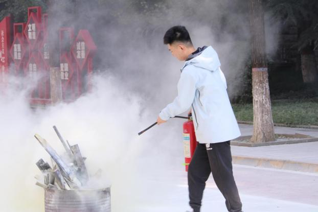 在老师们的带领下,同学们来到东门旁的空地处进行实操演练。孙晓盼老师用油桶点燃柴火,亲自示范灭火过程,向同学们强调使用灭火器的正确操作步骤:一提、二拔、三瞄、四压,并手把手指导大家如何正确使用。